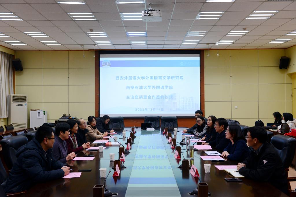 我校外國語學(xué)院黨委書記田虹霞介紹了學(xué)院的基本情況,著重就學(xué)院近年來的教學(xué)科研、師資隊伍、人才培養(yǎng)、社會服務(wù)等情況進(jìn)行交流。西安外國語大學(xué)外國語言文學(xué)研究院院長黃立波介紹了研究院基本情況及近3年取得的重要學(xué)術(shù)成果。雙方代表圍繞教育教學(xué)、科學(xué)研究、人才培養(yǎng)等方面的合作展開熱烈討論與交流。