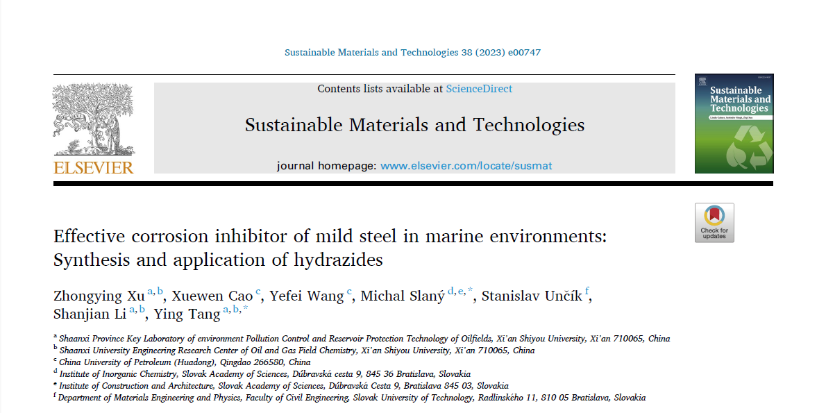 近日,我校與中國(guó)石油大學(xué)(華東)、斯洛伐克科學(xué)院合作在能源環(huán)境領(lǐng)域國(guó)際權(quán)威學(xué)術(shù)期刊《Sustainable Materials and Technologies》(IF=9.6)發(fā)表題為《Effective corrosion inhibitor of mild steel in marine environments: Synthesis and application of hydrazides》的論文。