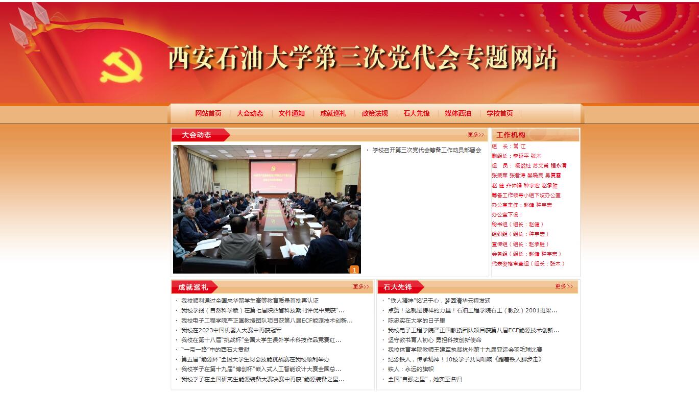 為營造好迎接黨代會勝利召開的濃郁氛圍,宣傳好黨代會精神,對黨代會確立的今后一個時期學校改革、建設、發(fā)展宏偉目標進行全方位宣傳報道,按照校黨委的統(tǒng)一部署,黨代會籌備工作領導小組宣傳組設計制作了“西安石油大學第三次黨代會專題網站”。專題網站網址為http://ddh.xsyu.edu.cn/,可在學校主頁點擊進入。