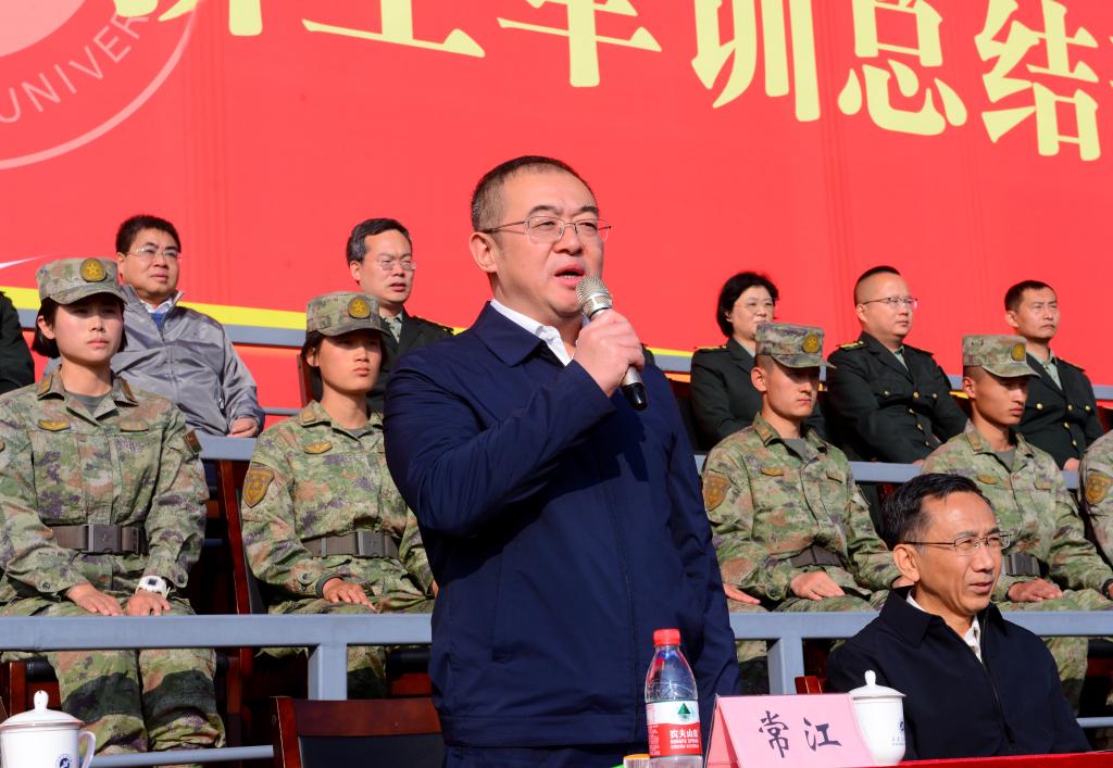 軍訓(xùn)領(lǐng)導(dǎo)小組組長、校黨委副書記張木作軍訓(xùn)總結(jié)講話。他代表學(xué)校對(duì)承訓(xùn)部隊(duì)全體教官表示感謝,對(duì)參訓(xùn)師生圓滿完成軍訓(xùn)任務(wù)表示祝賀,充分肯定了2023級(jí)本科生軍訓(xùn)工作取得的成績,并向廣大參訓(xùn)學(xué)生提出三點(diǎn)希望:一是不忘初心,爭做志存高遠(yuǎn)的大學(xué)生;二是銳意進(jìn)取,爭做勤學(xué)苦干的大學(xué)生;三是錘煉品格,爭做引領(lǐng)風(fēng)尚的大學(xué)生。