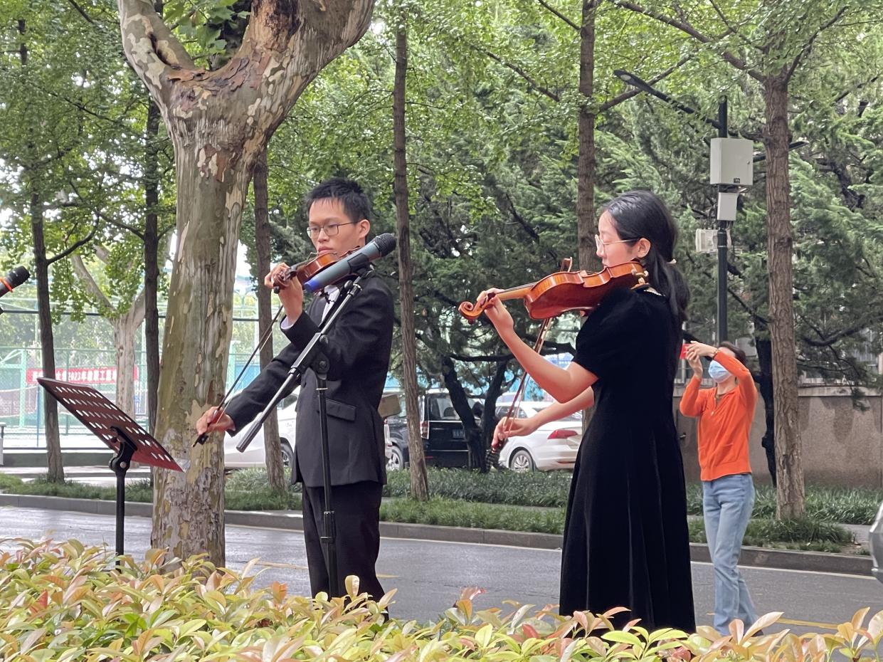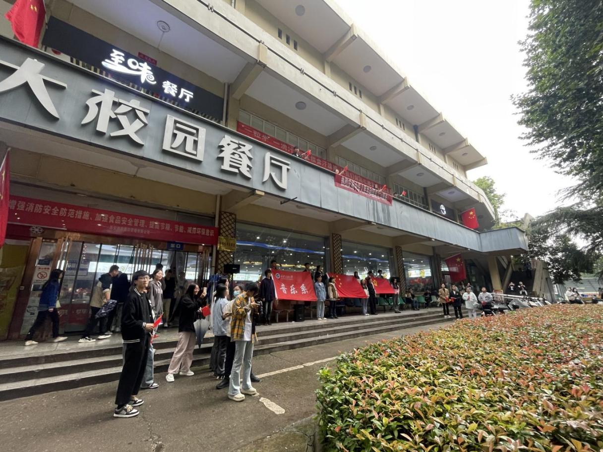 伴隨著歡快的音樂聲,中午12點10分,參加快閃活動的學(xué)生們從四處聚攏到餐廳前,首先以合奏的形式演繹了《我和我的祖國》,在優(yōu)美的旋律中,學(xué)生飽含深情地演唱了《萬江》《小白楊》《大紅公雞毛腿腿》《歡聚一堂》,用歌聲致敬偉大的黨、偉大的祖國和偉大的時代,用飽滿的熱情、嘹亮的歌聲、鏗鏘的節(jié)拍抒發(fā)自身的報國之志。最后師生集體合唱了校歌《輝煌明天》,用歌聲抒發(fā)心中愛國熱忱,用鏡頭向祖國母親告白。活動在師生們“祝祖國母親生日快樂”的歡呼聲中圓滿結(jié)束。