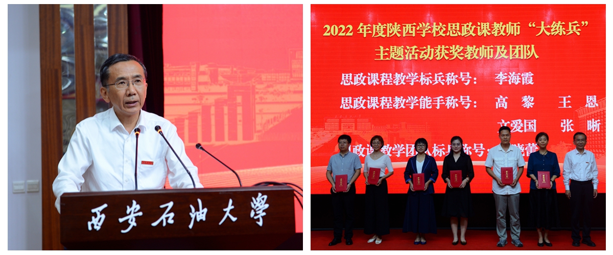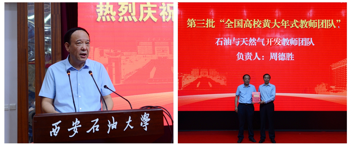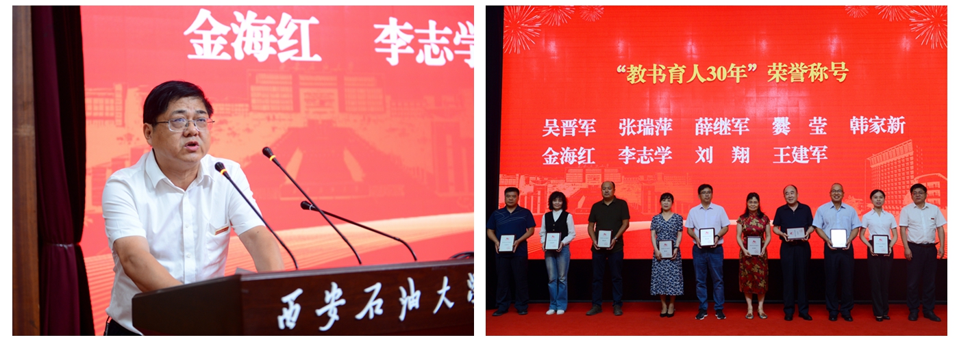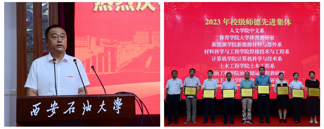 會上,校黨委書記賽云秀宣讀了《教育部關(guān)于公布第三批“全國高校黃大年式教師團(tuán)隊(duì)”創(chuàng)建示范活動入圍名單的通知》《陜西省教育廳關(guān)于公布第二批陜西省高校黃大年式教師團(tuán)隊(duì)的通知》,并為獲獎團(tuán)隊(duì)頒獎;校長李天太宣讀了《教育部關(guān)于公布第二批國家級一流本科課程認(rèn)定結(jié)果的通知》和2021-2022年度省科學(xué)技術(shù)獎獲獎項(xiàng)目名單,并為獲獎團(tuán)隊(duì)和個(gè)人頒獎;校黨委副書記、紀(jì)委書記、監(jiān)察專員李延平宣讀了《陜西省教育廳關(guān)于表彰第十三屆陜西普通本科高等學(xué)校教學(xué)名師獎獲獎教師的通知》,并為獲獎教師頒獎;校黨委副書記張木宣讀了《中共陜西省委教育工委 陜西省教育廳關(guān)于對2022年陜西學(xué)校思政課教師“大練兵”主題活動中表現(xiàn)突出教師進(jìn)行表揚(yáng)的通知》,并為獲獎?wù)哳C獎;副校長楊戰(zhàn)社宣讀了《陜西省科學(xué)技術(shù)廳關(guān)于公布2022年度中青年科技創(chuàng)新領(lǐng)軍人才、科技創(chuàng)新創(chuàng)業(yè)人才及2023年度青年科技新星入選人員的通知》,并為入選者頒獎;副校長程永清宣讀了《中共西安石油大學(xué)委員會 西安石油大學(xué)關(guān)于表彰2023年師德建設(shè)先進(jìn)集體和師德先進(jìn)個(gè)人的決定》,并為獲獎教師頒獎;副校長張榮軍宣讀了《中共西安石油大學(xué)委員會 西安石油大學(xué)關(guān)于表彰2023年優(yōu)秀教師 先進(jìn)教育工作者的決定》,并為獲獎教師代表頒獎;總會計(jì)師樊曉民宣讀了《西安石油大學(xué)關(guān)于表彰獎勵“教書育人30年”教師的決定》,并為獲獎教師頒獎。