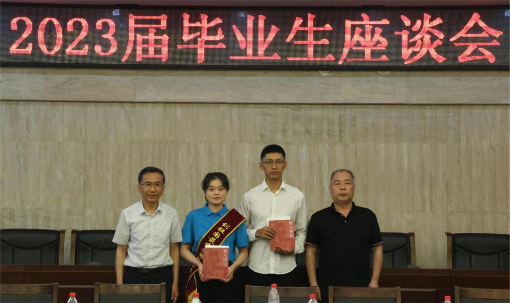 座談會后,張木和陳軍斌代表學(xué)校向畢業(yè)生代表贈送了書籍。