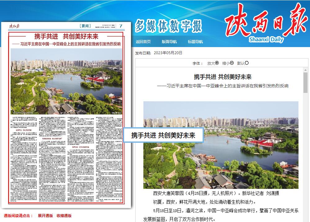 陜西日報》之《攜手共進 共創(chuàng)美好未來——習(xí)近平主席在中國—中亞峰會上的主旨講話在我省引發(fā)熱烈反響》鏈接:https://esb.sxdaily.com.cn/pc/content/202305/20/content_809583.html