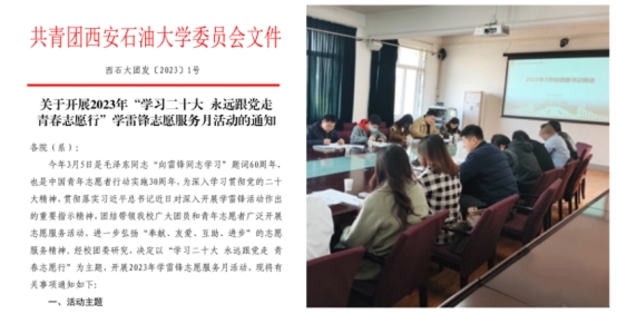一是發(fā)揮共青團(tuán)的組織優(yōu)勢,面向全校青年學(xué)生發(fā)布《關(guān)于開展2023年“學(xué)習(xí)二十大 永遠(yuǎn)跟黨走 青春志愿行”學(xué)雷鋒志愿服務(wù)月活動的通知》,在學(xué)校各級團(tuán)組織集中開展為期一個(gè)月的“學(xué)雷鋒”志愿服務(wù)活動,活動范圍覆蓋關(guān)愛留守兒童、鄉(xiāng)村振興、助殘助老、生態(tài)環(huán)保、文明校園等方面。二是理論聯(lián)系實(shí)際,推動工作提質(zhì)增效,組織各院系團(tuán)委書記、團(tuán)支部書記學(xué)習(xí)習(xí)近平總書記對深入開展學(xué)雷鋒活動的重要指示精神,并結(jié)合實(shí)際對在我校如何推進(jìn)“學(xué)雷鋒”志愿服務(wù)工作取得實(shí)效進(jìn)行了研討和工作部署。三是推進(jìn)志愿服務(wù)工作組織規(guī)范化建設(shè),推薦教師和學(xué)生代表參加3月25日舉行的陜西省青年志愿者協(xié)會第五次會員代表大會,推薦我校青年志愿者協(xié)會入選“陜西省青年志愿者協(xié)會理事單位”。
