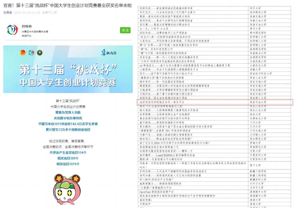 3月17日至19日,第十三屆“挑戰(zhàn)杯”中國(guó)大學(xué)生創(chuàng)業(yè)計(jì)劃競(jìng)賽終審決賽在北京理工大學(xué)舉行。經(jīng)過(guò)校賽、省賽和國(guó)賽角逐,由我校聶向榮、張榮軍、趙凱、楊懿老師指導(dǎo),石工教改2001班梁歡同學(xué)負(fù)責(zé)的《油田信息化和機(jī)械自動(dòng)化一體化平臺(tái)》項(xiàng)目,榮獲科技創(chuàng)新與未來(lái)產(chǎn)業(yè)組別國(guó)家級(jí)銅獎(jiǎng)。