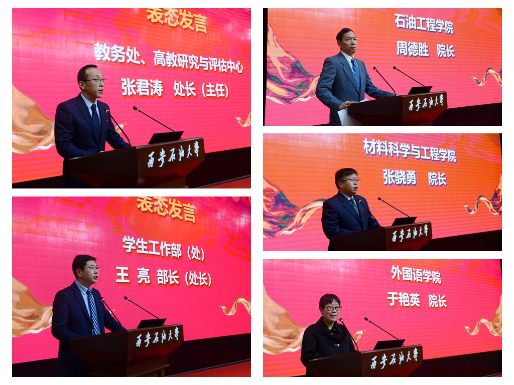 教務(wù)處、學(xué)生工作部、石油工程學(xué)院、材料科學(xué)與工程學(xué)院、外國語學(xué)院主要負(fù)責(zé)人分別代表各職能部門和院(系)發(fā)言,他們表示將積極組織單位全體師生深入學(xué)習(xí)新一輪本科教育教學(xué)審核評估方案和要求,按照學(xué)校審核評估工作方案要求和此次本科教育教學(xué)審核評估工作部署推進(jìn)會會議精神,做好各項(xiàng)工作安排部署,全面落實(shí)立德樹人根本任務(wù),保質(zhì)保量按時(shí)完成各項(xiàng)審核評估工作。