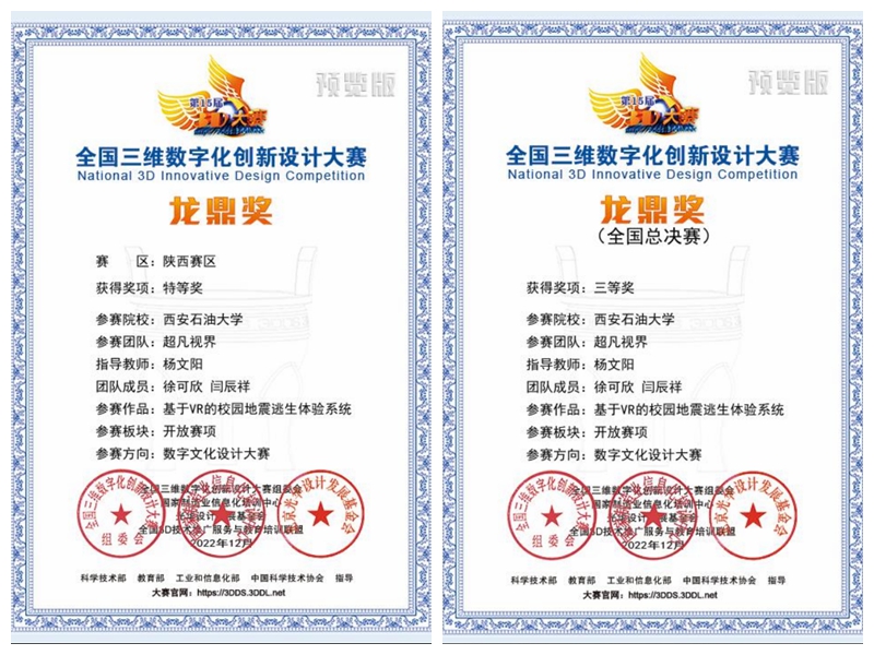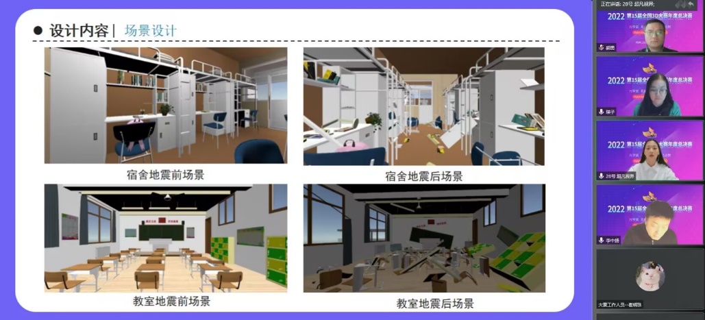 結合當前疫情防控形勢,全國總決賽采用了線上為主的方式進行,邀請百余位行業(yè)/院校/企業(yè)專家參與了總決賽作品的評審工作,評審主要考察設計創(chuàng)意性、技術應用創(chuàng)新性、工程實用性、美學、商業(yè)可開發(fā)價值、社會價值等多項因素。此次大賽開辟四類參賽作品類型:工業(yè)、文化、人居設計以及元宇宙創(chuàng)建大賽,參賽主題依據(jù)不同類型各有側重和特色。我校計算機學院學子的數(shù)字文化設計類作品《基于VR的校園地震逃生體驗系統(tǒng)》,以科普地震逃生知識和技能為背景,通過VR技術讓體驗者更為直觀生動的感受到地震發(fā)生時的情況,以新穎的方式增強學生面對地震突發(fā)時的應急能力,對地震應急救援有較好的應用價值。