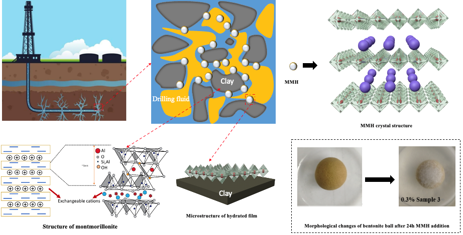 實驗表明,多種M-MMH具有強抑制作用,線性膨脹較4%KCl溶液中降低70%以上。進而對M-MMH漿作為鉆井液基漿的性能進行了評價,發(fā)現M-MMH漿具有低粘度和高切力的特點。在200℃下老化16小時后,其粘度和動塑比穩(wěn)定,表明其作為基漿具有很強的提高熱穩(wěn)定性作用。目前正在進行抗250℃水基鉆井液材料的研究,并且將基于該材料進一步開展具有抗高溫和強攜巖能力水基鉆井液體系研究,以解決我國高溫、超深鉆井液的技術需求。(Nanomaterials2022, 12, 3863.論文鏈接https://doi.org/10.3390/nano12213863)