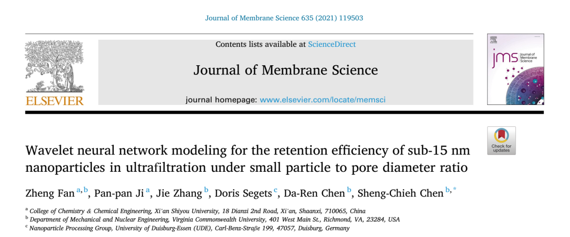 近日,我?;瘜W(xué)化工學(xué)院范崢、黃風(fēng)林科研團(tuán)隊(duì)以范崢為第一作者、西安石油大學(xué)為第一單位在國(guó)際膜科學(xué)領(lǐng)域?qū)W術(shù)期刊《Journal of Membrane Science》(JCR、中科院分區(qū)雙一區(qū)TOP期刊,IF=10.53)上發(fā)表題為《Wavelet neural network modeling for the retention efficiency of sub-15 nm nanoparticles in ultrafiltration under small particle to pore diameter ratio》的高水平論文。