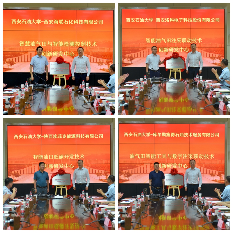 張榮軍代表西安石油大學(xué)分別與四家企業(yè)的總經(jīng)理為西安石油大學(xué)與四家公司的“智慧油氣田與智能檢測控制技術(shù)創(chuàng)新研發(fā)中心”“智能油氣田注采聯(lián)動(dòng)技術(shù)創(chuàng)新研發(fā)中心”“智能油田低碳開發(fā)技術(shù)創(chuàng)新研發(fā)中心”“油氣田智能工具與數(shù)字注采聯(lián)動(dòng)技術(shù)創(chuàng)新研發(fā)中心”進(jìn)行揭牌,正式開啟與四家公司的產(chǎn)學(xué)研合作。學(xué)校還與四家企業(yè)還簽訂了“研究生聯(lián)合培養(yǎng)基地”。