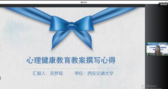 第三屆陜西高校心理健康教育教案評選一等獎獲得者西安交通大學(xué)吳夢瑤、空軍軍醫(yī)大學(xué)2021年度“十佳優(yōu)秀教案”獲得者吳迪兩位老師結(jié)合各自的獲獎教案分享了《心理健康教育教案撰寫心得》以及《教案書寫的心得與體會》,他們優(yōu)秀的教案讓參會者們看到了一線老師對待教學(xué)的用心、精心、恒心。