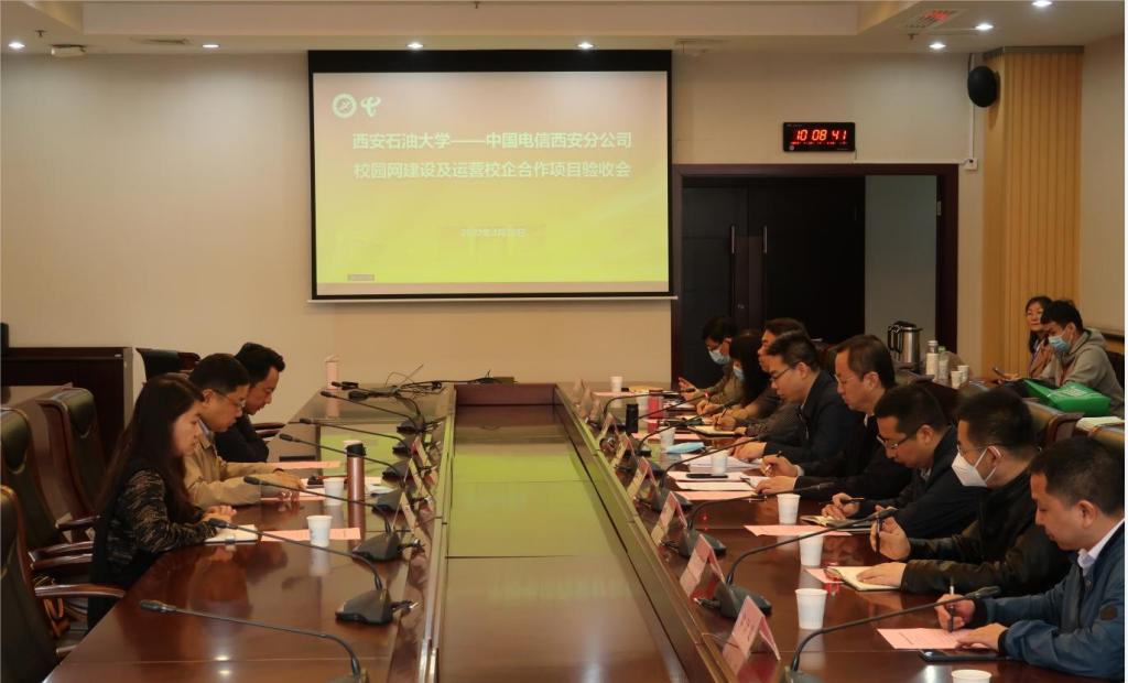 4月28日上午,學校在鄠邑校區(qū)圖書館第二會議室召開“西安石油大學—中國電信股份有限公司西安分公司 校園網(wǎng)建設及運營校企合作項目”驗收會。學校網(wǎng)絡安全與信息化工作領導小組副組長、副校長張榮軍,中國電信股份有限公司西安分公司副總經(jīng)理楊帆出席會議,學校黨政辦公室、學生工作部(處)、保衛(wèi)部(處)、審計處、財務處、國有資產(chǎn)處、資產(chǎn)經(jīng)營處、基建處、后勤處等學校網(wǎng)絡安全與信息化工作領導小組成員單位負責人以及西安電信校園運營中心總經(jīng)理王建成、總監(jiān)楊莎莎參加會議,會議由信息中心主任王學龍主持。