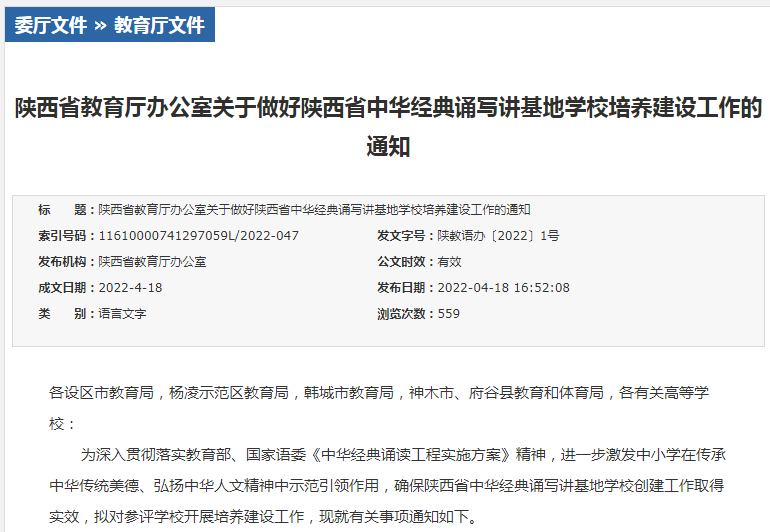 4月18日,陜西省教育廳辦公室發(fā)布了《關(guān)于做好陜西省中華經(jīng)典誦寫講基地學校培養(yǎng)建設工作的通知》(陜教語辦〔2022〕1號),我校成功獲批陜西省“中華經(jīng)典誦寫講基地”培養(yǎng)建設高校。