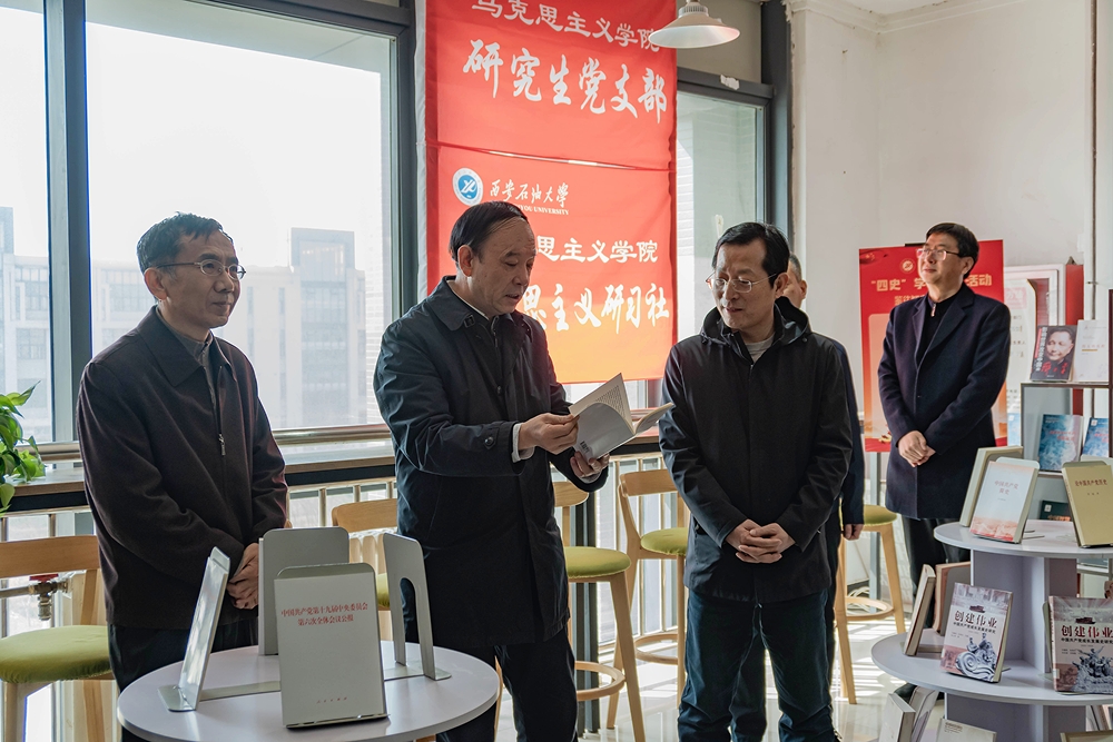 在鄠邑校區(qū),指導(dǎo)組一行參觀了鐵人紀(jì)念館、校史館、馬列書屋“黨史學(xué)習(xí)教育專區(qū)”、實習(xí)認(rèn)知園、省級石油石化虛擬仿真實驗教學(xué)示范中心;現(xiàn)場觀摩了我校期刊中心主任郭崗彥講授的“鐵人精神”通識教育課《破解鐵人之謎,解析精神密碼》第一課堂教學(xué)演示,馬克思主義學(xué)院教師張莉、學(xué)生王婉菲等開展的師生聯(lián)學(xué)《從鐵人精神中汲取奮進(jìn)力量》第二課堂教學(xué)演示,以及工程訓(xùn)練中心綜合實訓(xùn)室開展的VR現(xiàn)場教學(xué)演示;實地察看了“我為師生辦實事”項目進(jìn)展情況,了解學(xué)校在虛擬仿真實驗教學(xué)與實踐教學(xué)、體驗教學(xué)有機融合方面作出的互聯(lián)網(wǎng)下教育教學(xué)創(chuàng)新探索成效。在走訪黨史學(xué)習(xí)教育專區(qū)“馬列書屋”時,指導(dǎo)組與我校師生還就基層師生黨支部黨史學(xué)習(xí)教育開展情況作了現(xiàn)場交流。