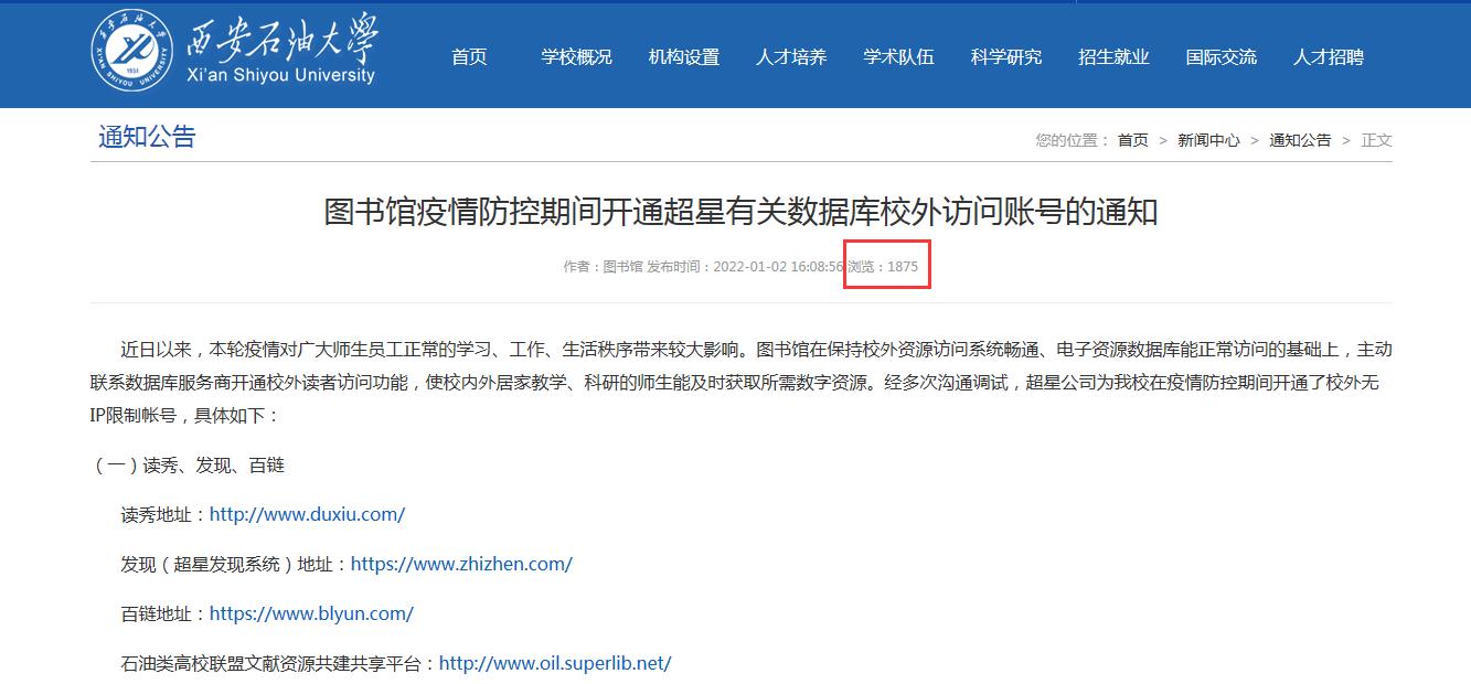 本輪疫情發(fā)生以來,疫情對(duì)廣大師生員工正常的學(xué)習(xí)、工作、生活秩序帶來較大影響。圖書館“想師生之所想,急師生之所急”,主動(dòng)作為做好電子資源服務(wù)保障工作,為我校師生線上開展教學(xué)科研工作提供優(yōu)質(zhì)的文獻(xiàn)資源服務(wù)。