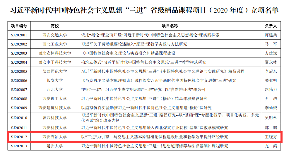 近日,省委教育工委發(fā)布了《中共陜西省委教育工委關(guān)于習近平新時代中國特色社會主義思想“三進”省級精品課程項目(2020 年度)立項的通知》,全省共有25項課程項目予以立項。我校馬克思主義學院王曉方教授申報的《以“三進”為引擎:馬克思主義基本原理概論課程建設質(zhì)量和教學效果提升路徑研究》入選立項名單。