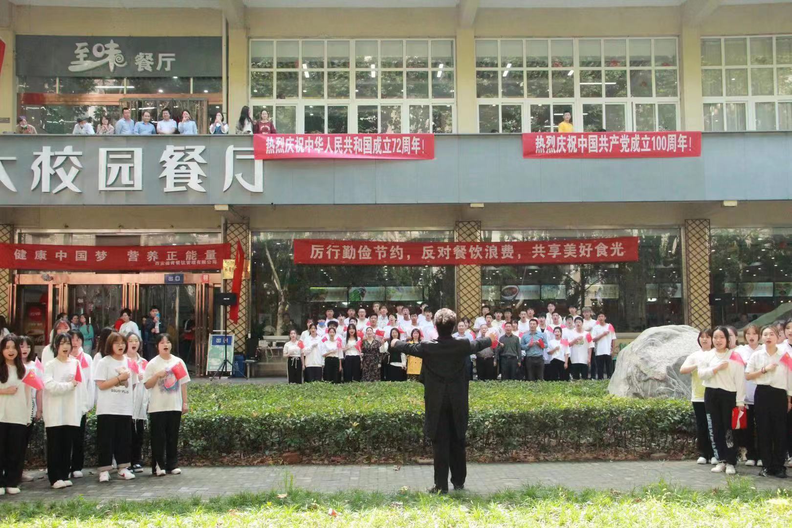 站在兩個一百年奮斗目標的歷史交匯點,為慶祝中華人民共和國72歲華誕和建黨100周年,930日中午,我校音樂系組織師生在雁塔校區(qū)學生餐廳舉辦“紅歌快閃”活動,吸引了眾多師生觀看,場面熱烈。副校長陳軍斌,紀委、規(guī)劃處、石油工程學院、經(jīng)濟管理學院、音樂系主要負責人,以及80余名音樂系師生參加了本次紅歌快閃活動。該活動由音樂系黨總支策劃,何云、毛楠、朱玥三位老師指導。音樂系已連續(xù)四年五次舉辦紅歌快閃活動,唱響主旋律,展現(xiàn)師生良好的精神風貌。