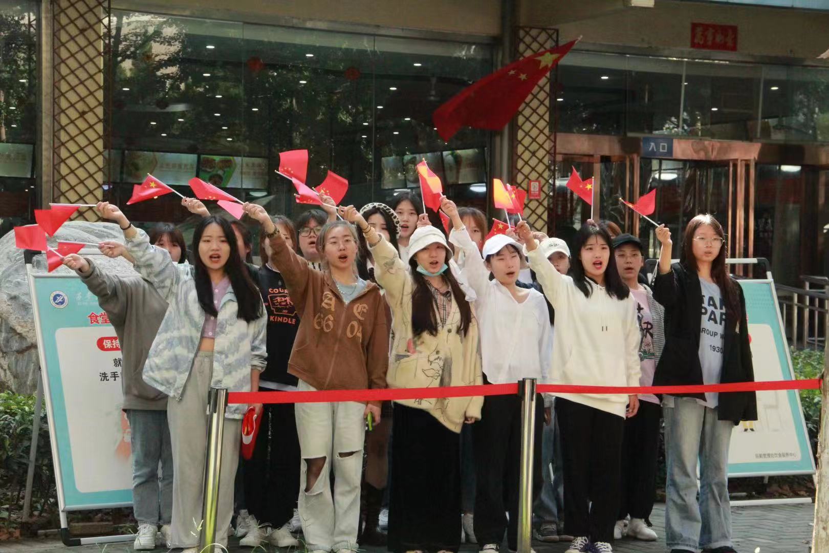中午1210分,紅歌快閃活動正式開始,首先以小合唱和歌伴舞演繹了《我和我的祖國》。在優(yōu)美的旋律中,手持紅旗的師生們集體合唱了《紅星閃閃》、《輝煌明天》兩首歌曲,用歌聲抒發(fā)心中愛國熱忱?;顒釉趲熒鷤儭拔以谖靼彩痛髮W祝祖國生日快樂!”的歡呼聲中圓滿結(jié)束。