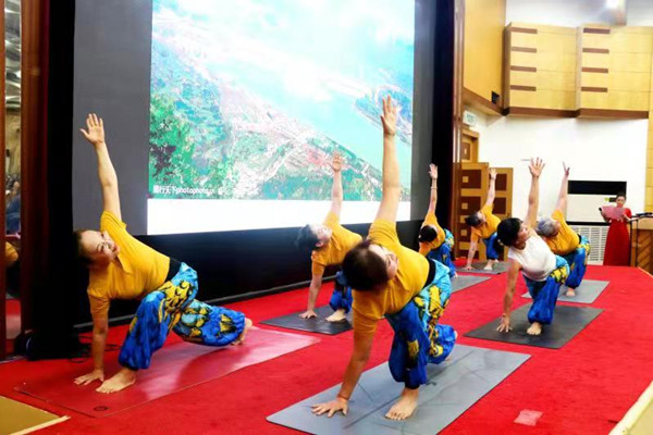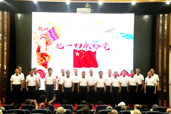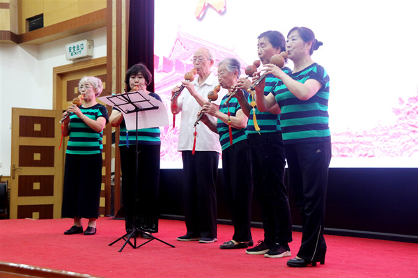 之后,老年大學(xué)的學(xué)員們和離退休教職工為大家?guī)砹司实奈乃嚬?jié)目。演出在開場(chǎng)舞《唱支山歌給黨聽》中拉開了帷幕。老年大學(xué)女子合唱隊(duì)帶來的女聲小合唱《沒有共產(chǎn)黨就沒有新中國(guó)》《中國(guó)一定強(qiáng)》,合唱團(tuán)男生小合唱《把一切獻(xiàn)給黨》,合唱團(tuán)女生小合唱《洪湖浪花》《天使的聲音》,葫蘆絲樂團(tuán)的聯(lián)奏《紅歌聯(lián)奏》等節(jié)目,充分展示了老年大學(xué)的教學(xué)成果和老同志熱愛黨、熱愛生活的良好精神面貌。黃放明老師京劇清唱《朝霞映在陽澄湖上》,老年大學(xué)瑜伽協(xié)會(huì)帶來的瑜伽表演《人間第一情》、馮原、漢澤西等老同志帶來的詩詞朗誦《人民萬歲》《西石大賦》,展示了離退休教職工的多才多藝。文藝演出最后,我校原校長(zhǎng)張寧生教授領(lǐng)唱,老年大學(xué)合唱團(tuán)60多名團(tuán)員共同演唱的《不忘初心》《我家在中國(guó)》,將老同志、老黨員對(duì)偉大祖國(guó)的熱愛匯集成流淌的歌聲,祝福偉大的祖國(guó)繁榮昌盛,祝福偉大的黨永遠(yuǎn)不忘初心,將現(xiàn)場(chǎng)氣氛引向高潮。