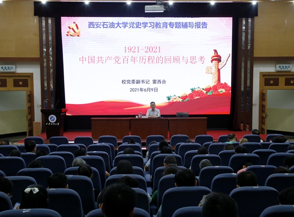 69日上午,校黨委副書記雷西合在雁塔校區(qū)學(xué)術(shù)報告廳作了題為《中國共產(chǎn)黨百年歷程的回顧與思考》黨史學(xué)習(xí)教育專題輔導(dǎo)報告。學(xué)校各民主黨派成員、無黨派人士、機關(guān)黨委黨員230余人參加了報告會。報告會由校黨委委員、統(tǒng)戰(zhàn)部部長、機關(guān)黨委書記吳復(fù)雷主持。