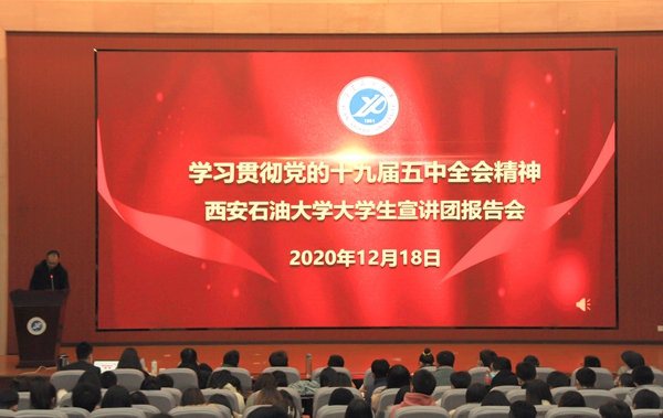 為學(xué)習(xí)宣傳貫徹黨的十九屆五中全會(huì)精神,推動(dòng)全會(huì)精神入腦入心,按照省委教育工委、省教育廳的相關(guān)安排,我校成立了貫徹黨的十九屆五中全會(huì)精神大學(xué)生宣講團(tuán)。1218日下午,宣講團(tuán)同時(shí)在鄠邑校區(qū)弘石報(bào)告廳、雁塔校區(qū)第五會(huì)議室開(kāi)講。校黨委副書(shū)記雷西合,黨委宣傳部、馬克思主義學(xué)院負(fù)責(zé)人,500余名研究生、本科生參加了宣講會(huì)。