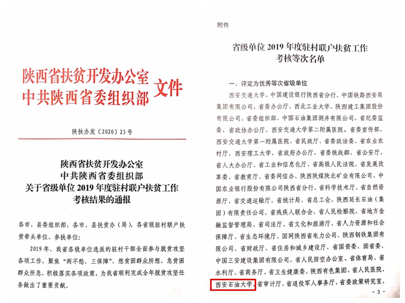 近日,陜西省扶貧開發(fā)辦公室、中共陜西省委組織部聯(lián)合發(fā)文,對2019年度全省駐村聯(lián)戶扶貧考核工作結(jié)果進行了通報。我校駐村扶貧工作經(jīng)過嚴格評定,考核結(jié)果為優(yōu)秀。