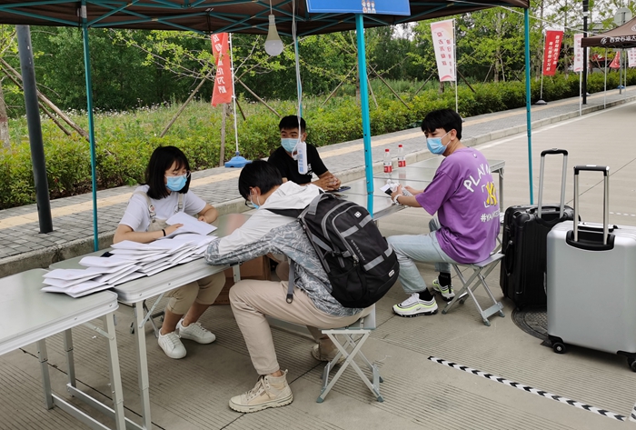 學工部(學生處)干部、各學院副書記、輔導員在接待點堅守,在學生返校后第一時間做好信息登記、教育提醒和溫馨提示,并向?qū)W生發(fā)放“防疫愛心禮包”。
