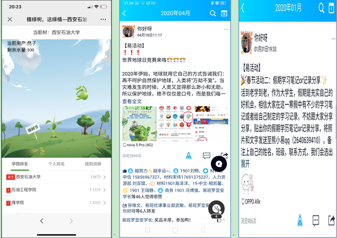 寒假至今,校易班發(fā)展中心累計開展線上活動9次,圍繞防疫教育和中國加油等主題,扎實開展正能量特色活動。通過開發(fā)易班輕應用,獨創(chuàng)“植樹節(jié)為學校云植樹”的愛校榮?;顒?,日參與量近千人,截至目前參與總人數(shù)過萬人。通過此類活動,進一步增強了學生的集體榮譽感,提升了學生參與網(wǎng)絡思政活動的主動性,也為我校今后持續(xù)開展網(wǎng)絡思政育人工作積累了寶貴經(jīng)驗。