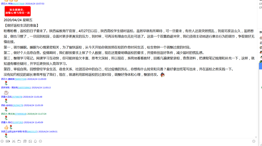 撰寫“兩封書信”,傾情守護(hù)凝心聚力。131日,學(xué)校發(fā)出《給湖北籍西石大學(xué)子的一封信》,向身處疫區(qū)中心的學(xué)生送去母校的牽掛與撫慰,與湖北籍學(xué)生及家人一起抗疫。26日,發(fā)布《給陜西高校班級心理委員的倡議書》,并通過陜西省委教育工作委員會轉(zhuǎn)發(fā)全省各高校,鼓勵(lì)廣大學(xué)生骨干充分發(fā)揮朋輩優(yōu)勢,攜手互助,建立戰(zhàn)“疫”情境中的心理互助,在國家危機(jī)時(shí)洋溢青春的力量。