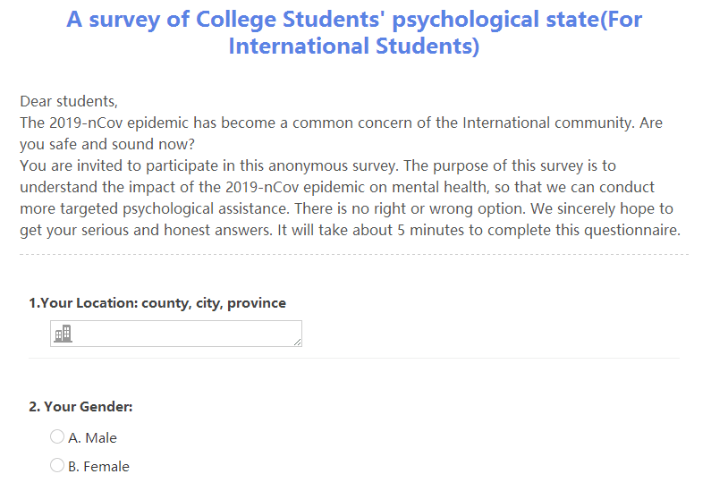 調(diào)研“四份問卷”,回應(yīng)師生心理需求。為更有針對性地進(jìn)行疫情下的心理教育,21--7日,油緣心理編制、發(fā)放四份中、英文調(diào)查問卷:《新型肺炎來了,你還好嗎?--疫情期間心理狀況調(diào)研》,了解高校師生、社會大眾及國際學(xué)生當(dāng)下的心理狀況及心理幫扶需求。根據(jù)調(diào)研結(jié)果,以師生現(xiàn)實(shí)需要為問題點(diǎn),設(shè)計(jì)“危機(jī)中成長—后新冠肺炎時(shí)期心理健康教育系列講座”,幫助師生獲得科學(xué)的心理調(diào)適方法,促進(jìn)師生在突發(fā)公共衛(wèi)生事件背景下的心理成長。