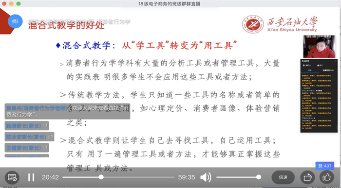 經(jīng)濟(jì)學(xué)系和管理科學(xué)與工程系。為了保障教學(xué)效果,經(jīng)濟(jì)學(xué)系和管科系的老師們也積極踐行“線上”+“線下”的混合式教學(xué)方式,將在線教學(xué)和傳統(tǒng)教學(xué)的優(yōu)勢(shì)結(jié)合起來(lái),把學(xué)習(xí)者的學(xué)習(xí)由淺到深地引向深度學(xué)習(xí)。老師們提前制定預(yù)案,從課程準(zhǔn)備、課程資源、課堂教學(xué)、師生互動(dòng)、指導(dǎo)答疑和作業(yè)考評(píng)等方面進(jìn)行教學(xué)設(shè)計(jì)和思考。課程多采用多平臺(tái)相結(jié)合方式進(jìn)行開(kāi)展,如中國(guó)mooc課程+釘釘直播教學(xué)+釘釘/微信。選用中國(guó)mooc平臺(tái)的“國(guó)家精品課”開(kāi)展基礎(chǔ)知識(shí)學(xué)習(xí);通過(guò)釘釘直播,開(kāi)展與章節(jié)內(nèi)容相關(guān)的消費(fèi)者行為學(xué)問(wèn)題討論;通過(guò)釘釘班級(jí)群/微信群,發(fā)布學(xué)習(xí)重難點(diǎn)、作業(yè),保障溝通的及時(shí)性。這種多平臺(tái)相結(jié)合的形式,既拓展了學(xué)生自主學(xué)習(xí)能力、鍛煉了學(xué)生學(xué)以致用的思辨能力,更重要的是培養(yǎng)學(xué)生們做“建設(shè)者”的意識(shí),學(xué)生反饋效果良好。