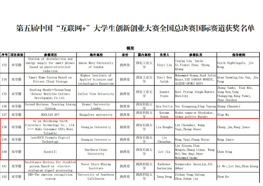 近日,教育部公布了第五屆中國(guó)“互聯(lián)網(wǎng)+”大學(xué)生創(chuàng)新創(chuàng)業(yè)大賽獲獎(jiǎng)名單,經(jīng)過校賽、省賽、全國(guó)網(wǎng)上評(píng)審等環(huán)節(jié)的角逐,我校在本屆大賽中榮獲佳績(jī),獲得總決賽國(guó)際賽道銅獎(jiǎng)3項(xiàng),陜西省賽金獎(jiǎng)1項(xiàng)、銀獎(jiǎng)7項(xiàng)、銅獎(jiǎng)3項(xiàng)。