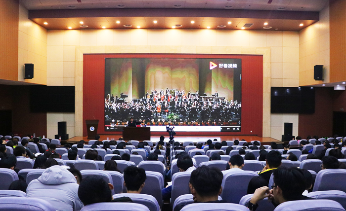 高賀杰老師以一幅圖為引,延伸到聲音。他指出,聲音是傳遞信息的一種基本方式,聲音延伸出音樂,“聰,耳聞而循心通上”,聰(聽)是一個人智慧的標志。隨后,高老師列舉不同領(lǐng)域名家實例詮釋音樂,并為同學們闡釋了怎樣聽音樂以及聽音樂的禮儀。他強調(diào),音樂是需要想象力的,因為音樂的無造型性、無語義性,所以聽聲聯(lián)想畫面能更深層次的體會其內(nèi)涵。最后,高老師為同學們播放并解析著名音樂家柴科夫斯基的《1812序曲》,使同學們感受到交響樂的魅力。