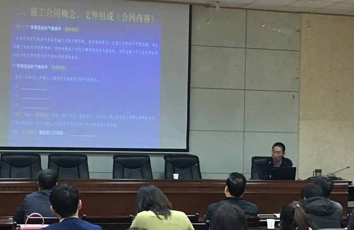 專題講座上,徐雷教授圍繞建筑工程合同管理中的合同概述、施工合同概念文件組成、施工合同的特點(diǎn)、施工合同風(fēng)險(xiǎn)識別障礙、施工合同索賠問題以及施工合同管理方法建議等六個方面,進(jìn)行了詳細(xì)地講解。講座中穿插了大量的實(shí)際案例,具有較強(qiáng)的針對性和實(shí)踐性。講座結(jié)束后與會人員積極向徐教授提問請教,現(xiàn)場氣氛熱烈。