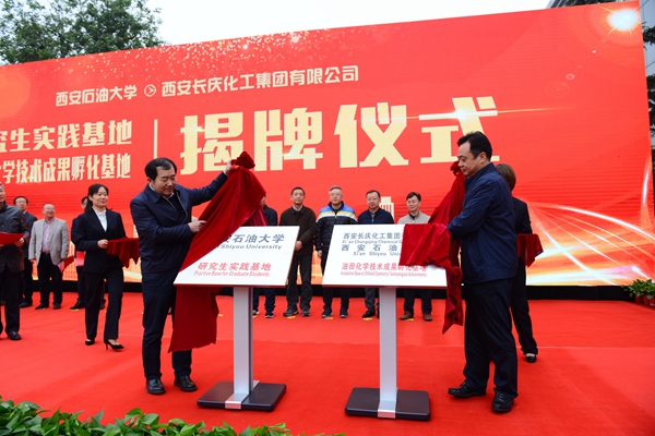 我校校長(zhǎng)李天太、長(zhǎng)慶油田分公司副總經(jīng)理石道涵分別代表雙方共同為西安石油大學(xué)“研究生實(shí)踐基地”及“油田化學(xué)科技成果孵化基地”揭牌。