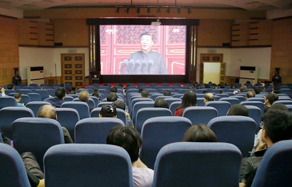 習(xí)近平主席的講話句句鏗鏘,直抵人心,“沒有任何力量能夠撼動我們偉大祖國的地位,沒有任何力量能夠阻擋中國人民和中華民族的前進(jìn)步伐”,“中國的昨天已經(jīng)寫在人類的史冊上,中國的今天正在億萬人民手中創(chuàng)造,中國的明天必將更加美好?!薄安煌跣摹⒗斡浭姑^續(xù)把我們的人民共和國鞏固好、發(fā)展好,繼續(xù)為實現(xiàn)‘兩個一百年'奮斗目標(biāo)、實現(xiàn)中華民族偉大復(fù)興的中國夢而努力奮斗!”等講話在師生中引起熱議。