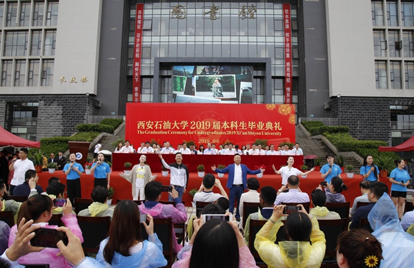 2019屆本科生畢業(yè)典禮在音樂系師生的“快閃”表演中拉開帷幕。音樂系師生在現(xiàn)場(chǎng)演唱了《老師我想你》《我為祖國獻(xiàn)石油》《我和我的祖國》三首歌曲,既表達(dá)了對(duì)恩師栽培的感恩之情,又體現(xiàn)了我校的石油石化特色,還蘊(yùn)含了慶祝新中國成立70周年的意義。