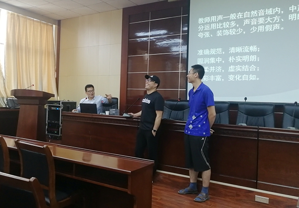 吟誦藝術(shù)國家級(jí)骨干教師、陜西師范大學(xué)何明家老師作了題為《教師教學(xué)發(fā)音技巧和嗓音保健》的講座。他從人體發(fā)聲器官解剖圖入手,深入淺出地剖析了發(fā)聲原理和影響人聲音質(zhì)的要素。他談到,教師的職業(yè)要求決定了正確發(fā)聲的必要性,一定要重視嗓音保健。他現(xiàn)場(chǎng)為發(fā)言的老師評(píng)估音質(zhì),分析發(fā)音存在的問題,結(jié)合現(xiàn)場(chǎng)案例,幫助青年教師正確理解發(fā)聲機(jī)理和運(yùn)用嗓音的技巧,并耐心傳授穩(wěn)定、協(xié)調(diào)、平衡發(fā)聲的技巧。