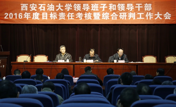 3月24日上午,省委組織部、省委高教工委在我校學(xué)術(shù)報(bào)告廳召開了西安石油大學(xué)領(lǐng)導(dǎo)班子和領(lǐng)導(dǎo)干部2016年度目標(biāo)責(zé)任考核暨綜合研判工作大會(huì)。省屬高校領(lǐng)導(dǎo)班子和領(lǐng)導(dǎo)干部目標(biāo)責(zé)任考核暨綜合研判第二工作小組組長、陜西省干部教育辦公室副主任郭文超出席會(huì)議并講話。校黨委書記賽云秀主持大會(huì)。省紀(jì)委駐教育廳紀(jì)檢組副組長易紅彬、省教育廳離退處副處長王亞麗、省委組織部宣教干部處主任科員李芃、省委高教工委組織部干部馮政清、西安理工大學(xué)人事處干部程瑤等考核組成員,我校校領(lǐng)導(dǎo)、校黨委委員、紀(jì)委委員、學(xué)術(shù)委員會(huì)委員、工會(huì)委員,正高職稱專業(yè)技術(shù)人員,正處級(jí)以上領(lǐng)導(dǎo)干部,市級(jí)以上人大代表、政協(xié)委員,民主黨派主要負(fù)責(zé)人,近三年退休的校級(jí)領(lǐng)導(dǎo)干部參加大會(huì)。