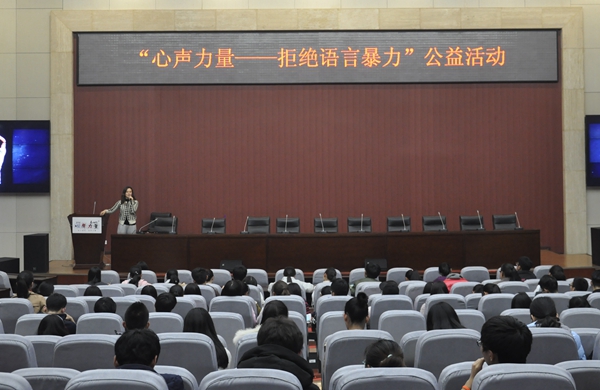 11月17日晚,由陜西廣播電視臺(tái)896汽車調(diào)頻《長(zhǎng)安夜話》節(jié)目發(fā)起,團(tuán)省委青少年權(quán)益維護(hù)中心、陜西省律師協(xié)會(huì)共同支持的“心聲力量——拒絕語(yǔ)言暴力”公益活動(dòng)在我校新校區(qū)舉辦。知名主播曉輝、馬小路、馬大帥擔(dān)任主講嘉賓,此次活動(dòng)由校團(tuán)委承辦。