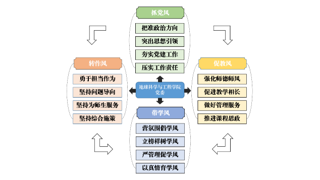 抓好黨建主責主業(yè):把堅定正確政治方向放在黨支部建設首位,抓黨建主責主業(yè)走深走實;集中學習教育注重講黨課的重要作用,理論實踐相結合助力教師健康成長。強化黨支部政治功能:堅持“三會一課”學習教育方法創(chuàng)新,提升黨支部政治功能;注重理論學習與教學科研實踐相結合,加強支部的政治功能發(fā)揮。提升思想政治工作質量:強化黨性教育與職業(yè)規(guī)范有機統(tǒng)一,有的放矢地提升思想政治工作質量;把思想政治學習教育輻射到專業(yè)課程思政實踐,強化課程思政協(xié)同育人作用。促進學校事業(yè)發(fā)展:堅持黨建工作促進學校事業(yè)發(fā)展原則,工作室教師黨員教學科研成績工作突出;注重課程育人與科研育人協(xié)同作用發(fā)揮,教書育人、服務學生成效顯著,勘查技術于工程專業(yè)2022年通過工程教育質量認證、應用地球物理系2022年9月獲得校級“師德先進集體”榮譽。加強黨支部班子建設:選優(yōu)配強工作室黨支部班子,基層黨建主責主業(yè)工作突出;注重對黨支部班子教育和扶持,支部委員在教學科研中的引領作用顯著。支部教師黨員近3年獲得校級教學成果2項;教師黨員參加教學比賽及大賽獲獎15項;獲得認定省級線下一流課程1項、省級課程思政示范課程及教學團隊1項。