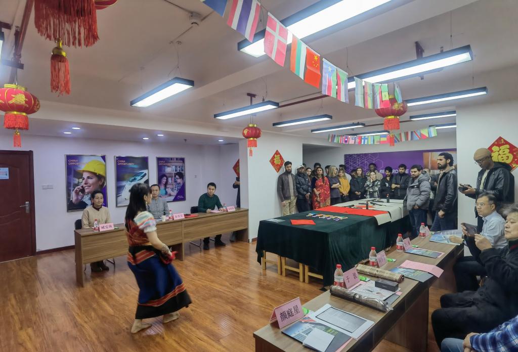 緊接著,國際學生們通過舞蹈、歌曲等才藝表演獻上新春祝福。他們的精彩表演不僅贏得了現(xiàn)場觀眾的陣陣喝彩,也為中國新年增添了濃厚的喜慶氛圍。隨后,活動進入書法家寫福字、寫對聯(lián)環(huán)節(jié)。陜西省民俗學會、省書法家協(xié)會、西安皇城書畫院等知名民俗專家、書法家紛紛揮毫潑墨,為國際學生書寫福字和春聯(lián)。書法家們的精湛技藝和中華悠久深厚的文化底蘊讓在場的留學生們贊嘆不已,他們紛紛表示這是他們第一次如此近距離地感受中國書法的魅力。