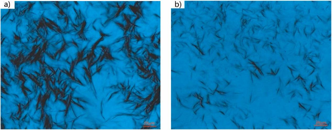 通過(guò)DSC和蠟晶形貌分析,探討了該藥物作為原油流動(dòng)改進(jìn)劑的可能機(jī)理:在未添加PI的情況下,蠟晶呈現(xiàn)聚集羽毛狀結(jié)構(gòu),蠟晶排列緊湊而規(guī)則(如下圖(a)所示);然而,添加500 ppm PI后蠟晶的形貌和結(jié)構(gòu)發(fā)生轉(zhuǎn)變,蠟晶分散度增加(如下圖(b)所示)。