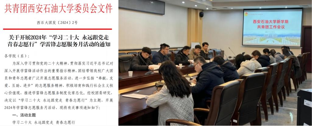 一是印發(fā)《關(guān)于開展2024年“學(xué)習(xí)二十大 永遠跟黨走 青春志愿行”學(xué)雷鋒志愿服務(wù)月活動的通知》,積極組織全校各級團組織圍繞關(guān)愛留守兒童、鄉(xiāng)村振興、助殘助老、生態(tài)環(huán)保等方面,集中開展為期一個月的“學(xué)雷鋒”志愿服務(wù)活動。二是召開學(xué)校共青團、學(xué)生會工作會議,及時組織各院系團委書記、學(xué)生會執(zhí)行主席,集中學(xué)習(xí)習(xí)近平總書記關(guān)于志愿服務(wù)重要指示精神,進一步加深對志愿服務(wù)工作的認識和理解。三是于3月5日學(xué)雷鋒紀(jì)念日當(dāng)天,組織我校300余名師生代表,在鄠邑校區(qū)東方廣場隆重舉行2024年“學(xué)雷鋒”志愿服務(wù)月啟動儀式。
