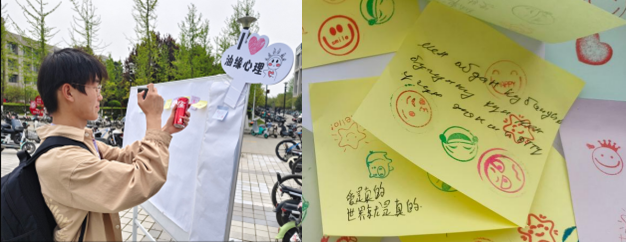 心理協(xié)會(huì)組織的“以德育心”展臺(tái)主題為“尋找缺失的一角”,引導(dǎo)同學(xué)們發(fā)掘優(yōu)勢(shì),探索目標(biāo),找準(zhǔn)個(gè)人發(fā)展方向;“以美潤(rùn)心”展臺(tái)主題為“眾人涂鴉”和“詩歌拼貼”,同學(xué)們通過活動(dòng)打破性別刻板印象,在創(chuàng)造中展示個(gè)人風(fēng)采。