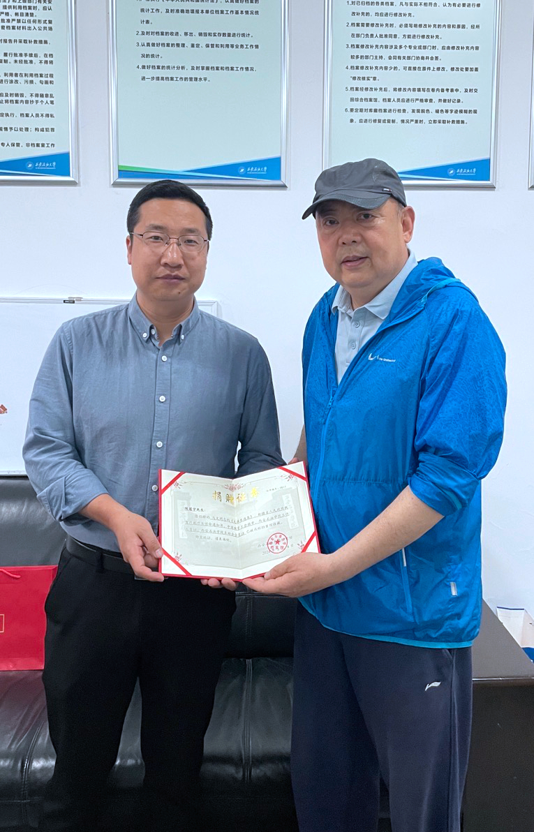 檔案館館長馬超為陳冠宇老師頒發(fā)了捐贈證書。
