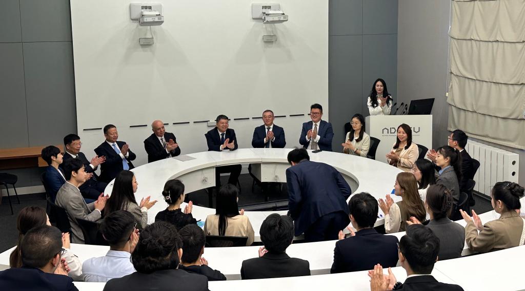 阿斯加洛夫在致辭中熱烈歡迎陜西省委團(tuán)組到訪,并簡(jiǎn)要介紹了學(xué)校發(fā)展概況,以及在國(guó)際化辦學(xué)中的經(jīng)驗(yàn)和成果。