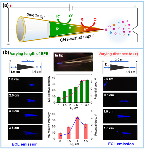 圖1.源內(nèi)紙基質(zhì)雙極性電化學-質(zhì)譜反應(yīng)裝置及電化學反應(yīng)過程魯米諾發(fā)光信號比較