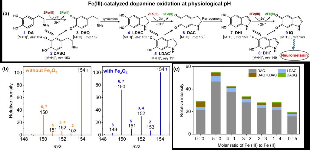 圖2.生理pH值條件下,源內(nèi)紙基質(zhì)雙極性電化學-質(zhì)譜技術(shù)對Fe(III)催化多巴胺的反應(yīng)機理研究
